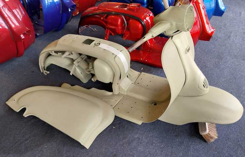 UNRESTORED LI SERIES 2 FRAME, PANELS, LEGSHIELDS, FOOTBOARDS, BRIDGE PIECE, HEADSET TOP AND BOTTOM, HORNCAST, FRONT MUDGUARD, REAR MUDGUARD, TOOLBOX,